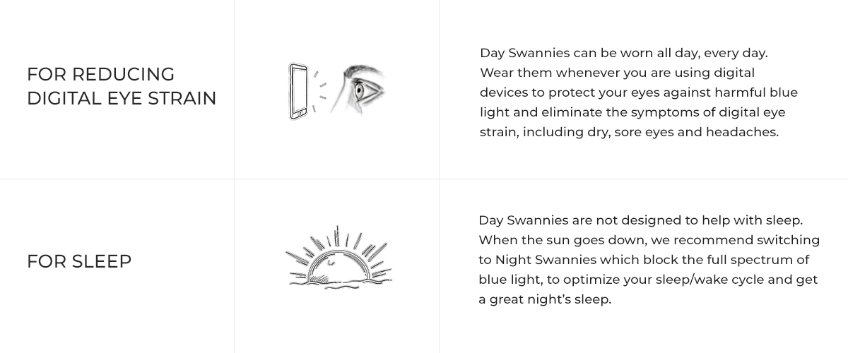 An independent study by SleepScore Labs showed that Night Swannies blue light blocking glasses resulted in significantly improved sleep, including an average of 33% increased sleepiness at bedtime, 11 minutes less time to fall asleep, and 24 minutes of reduced time awake during the night.