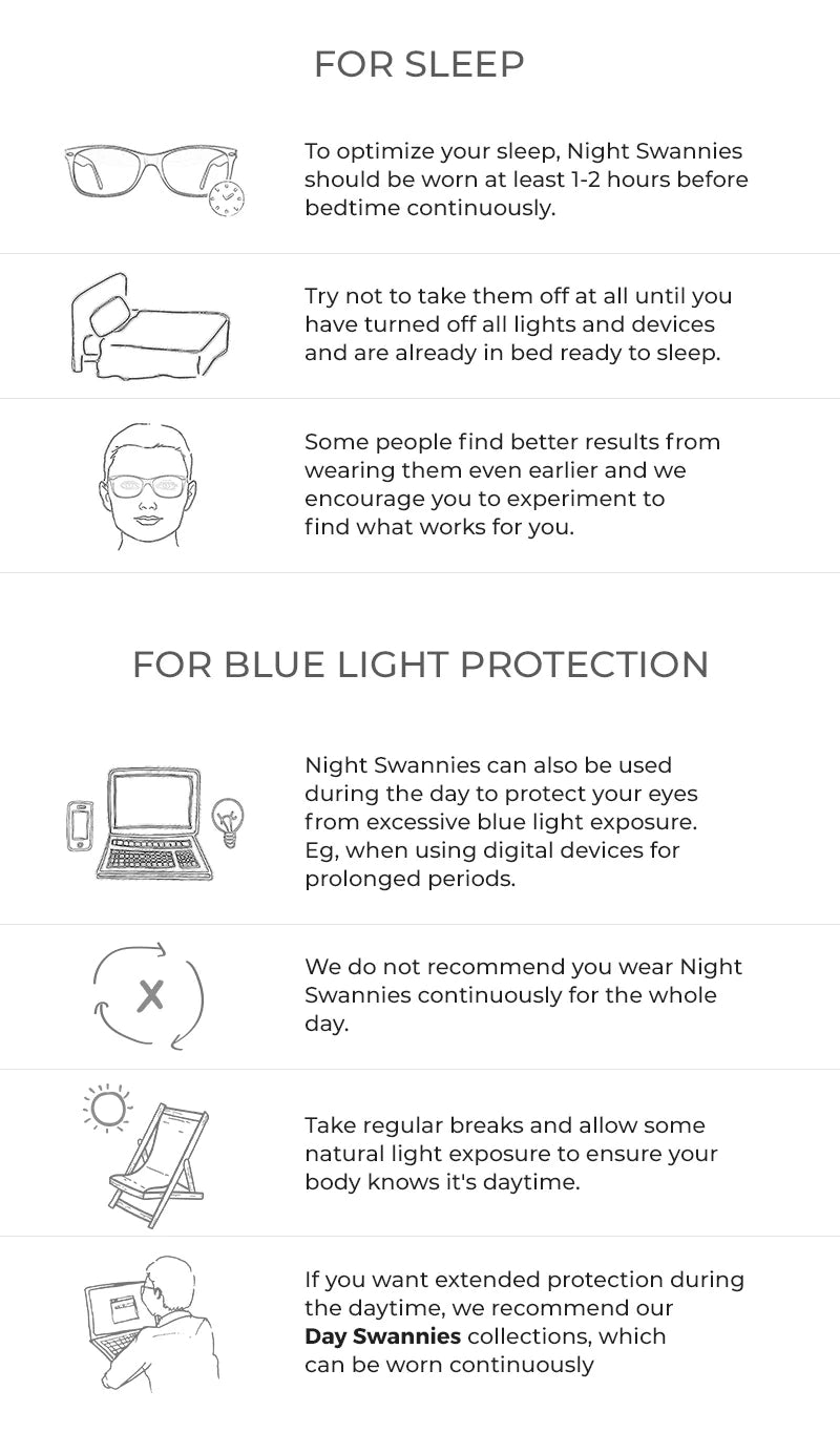 PROVEN RESULTS An independent study by SleepScore Labs showed that Night Swannies blue light blocking glasses resulted in significantly improved sleep, including an average of 33% increased sleepiness at bedtime, 11 minutes less time to fall asleep, and 24 minutes of reduced time awake during the night. |
