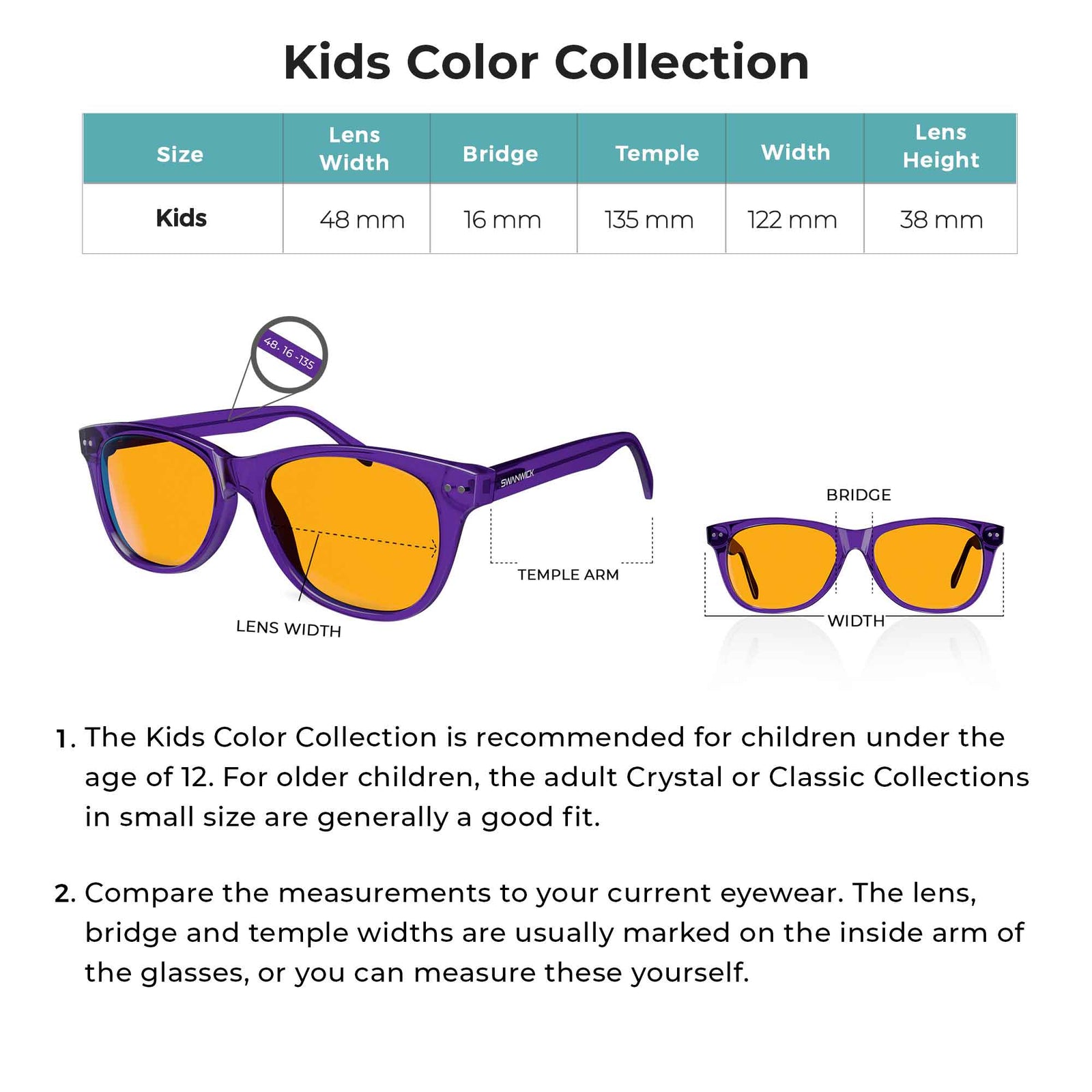 Science is revealing how exposure to blue light from devices like tablets, phones, and TVs can harm the growing eyes of children, not to mention causing major difficulties at bedtime for parents. Lack of quality sleep can cause problems in school as well as at home when motivation is key (that room STILL isn’t clean)?! Our solution – Kids Colors Night Swannies blue blocking glasses. These kids-size blue light blocking glasses protect young eyes from over 99% of harmful blue light, helping your child fall asleep faster and sleep more deeply all night long so you both can perform at your very best every day.